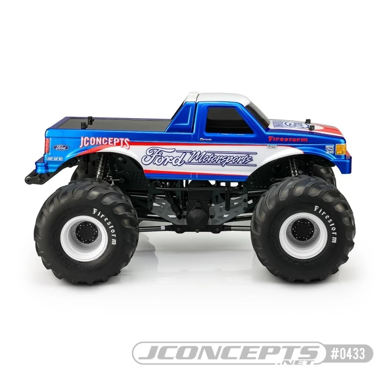 The 1989 F-Series carries over the same body style from the previous generation yet sports a new rounded front clip that improves vehicle aerodynamics over its predecessors. The softened body lines around the rear of the bed and large fender arches around the wheel wells provides the scale monster truck look. The body features flush-fitting grille and headlights, wrap-around parking lights, a minimalist grille and an accurate and clean-looking Ford | JConcepts decal sheet.