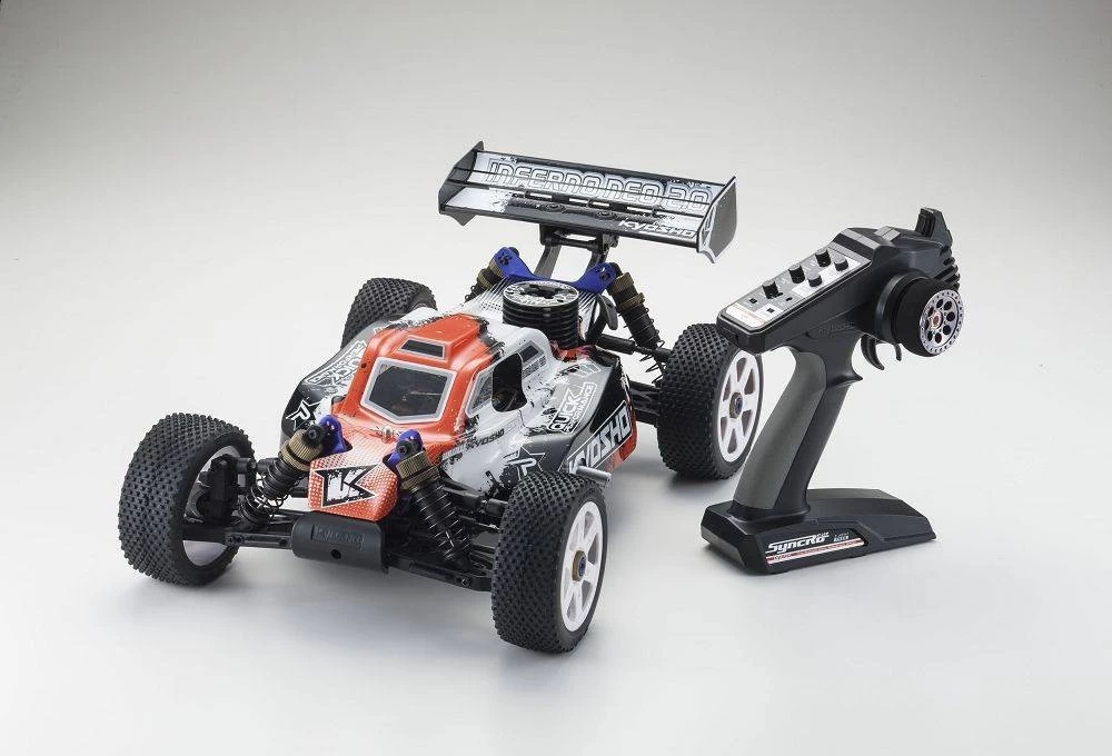 Crowned World Champion a record 8 times, the legendary Inferno DNA runs through the core of the next evolution in the Inferno NEO Readyset. Features including the front and rear shock stays of the MP777 provide rigidity and strength with precision off set to produce excellent traction, even over the rough surfaces. Combined with big bore shocks equipped with dial-adjustable tension, the effective damping force delivers sure-footed stability and easy control for beginners with the sharper response required by serious racers. In addition, universal swing shafts on the front provide extra reliability under severe racing conditions, when it’s needed most. A new aerodynamic cab forward body design produces stable posture through the air and reinforces its competitive edge with frontal down force. With the proven KE21R engine (based on the KE25) installed, the machine thrives on the ideal balance of power, torque and stability. Fitted with recoil starter, the 21-class engine is fast and simple to start too. The Readyset is equipped with the 2.4GHz Syncro KT-231P R/C system and KS4031-06W servos. Multiple setting points hold fast to deliver effective performance that can be relied upon under the pressure of hard racing. With two color variations to choose from, the Inferno NEO 2.0 provides the best 1/8 off-road buggy experience from all angles.
