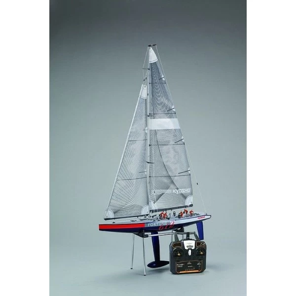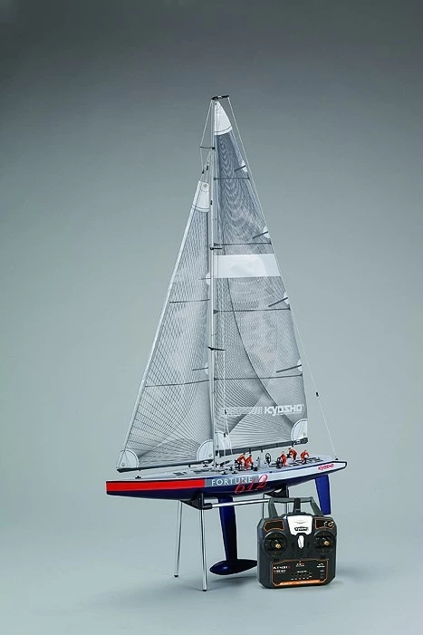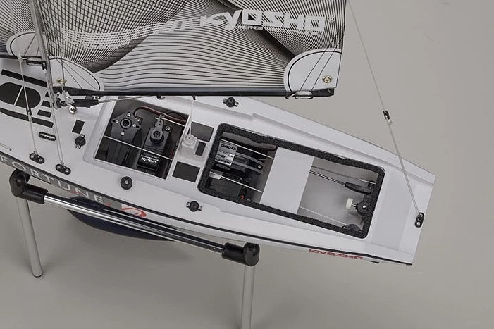 The fascinating world of yachting is captured in all its glory in this compact 612mm long yacht created. Scale parts and pre-painted figures adorn the deck so this model can also take pride of place as an interior display. But it is more at home on the water where no compromise has been made in the full application of Kyosho’s renowned yacht design skills. Sail shape and aspect ratio combine with the precision hull and keel design to generate efficient power through the water as the wind fills the sails for scale performance more than equal to full size yachts. The bright color-printed sails are created in PE material with optimal elasticity, durability and permeability to produce real racing yacht performance. A 2.4GHz R/C system provides interference-free control of the pre-assembled and pre-painted hull so you can start sailing almost as soon as you take it out of the box. Separate structure of the rudder and keel make transport easy and convenient. Discover the fascinating experience of yacht racing, made ready and real for you to enjoy with the FORTUNE 612II.