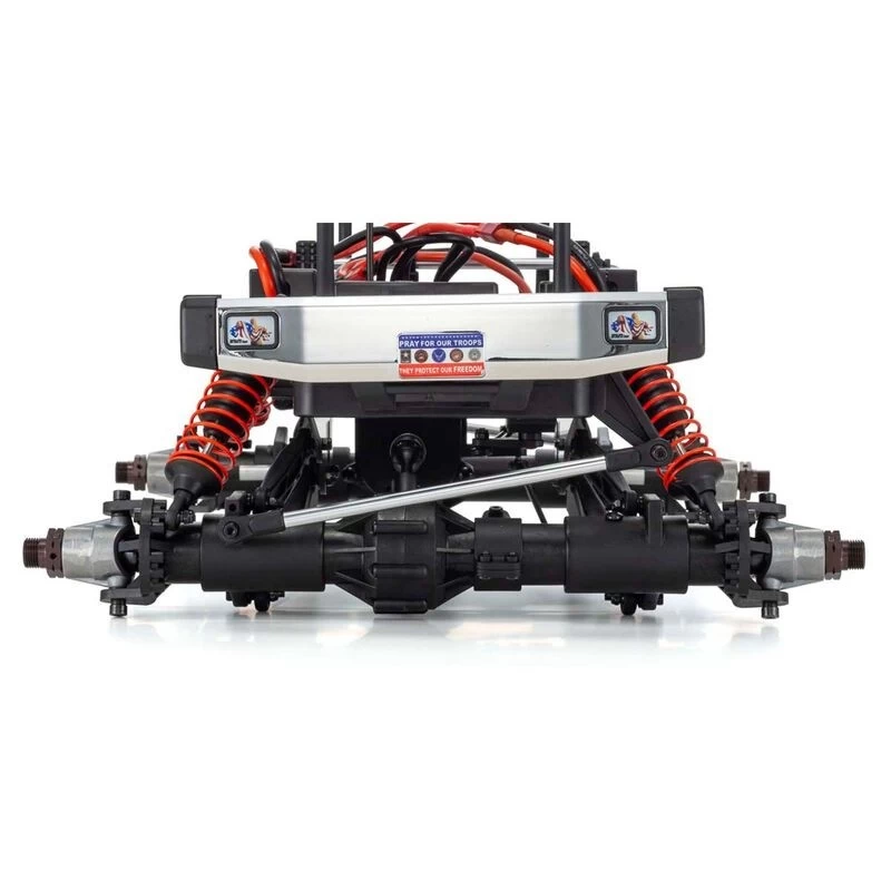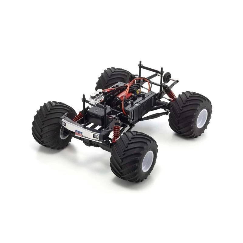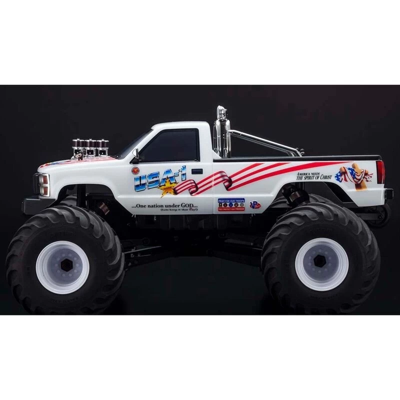 Born in the USA, the monster truck symbolizes America: big, bold and powerful! With pickup truck bodies emblazoned with dynamic motifs mounted on super tough chassis structures and big engines to power huge tires, monster truck racing filled and thrilled stadiums around America and the world with their awesome power and speed. Recreated in 1/8 scale as an R/C truck, the โUSA-1โ flies the American flag loud and proud as the recognized symbol of monster trucking. Dating back to the 1990โs, Kyoshoโs earlier versions have been fully renewed with a newly created ULTRA SCALE body, uniquely reinforced 5-link suspension and stronger solid axles originally used on the Mad Crusher and FO-XX 2.0. Equipped with a high-power brushless motor with a 4-pole rotor and 12-slot stator generating 2300KV, the VE (electric power version) delivers outrageous speed and power characteristics that would rival that of the real USA-1. The high-powered unit produces dynamic performance that makes the large 570mm body length of the USA-1 feel smaller with acceleration pickup from a standing start surpassing that of the GP (engine powered) version. As a pre-assembled Readyset, the body is immaculately finished with paint and livery to capture the rich sense of scale of this iconic 1990โs machine. A charged motor battery and batteries for the transmitter are all that is required to start the action. With spare parts and a wide range of optional parts available to continually maintain and enhance performance, your USA-1 will provide thrilling fun over a long time.