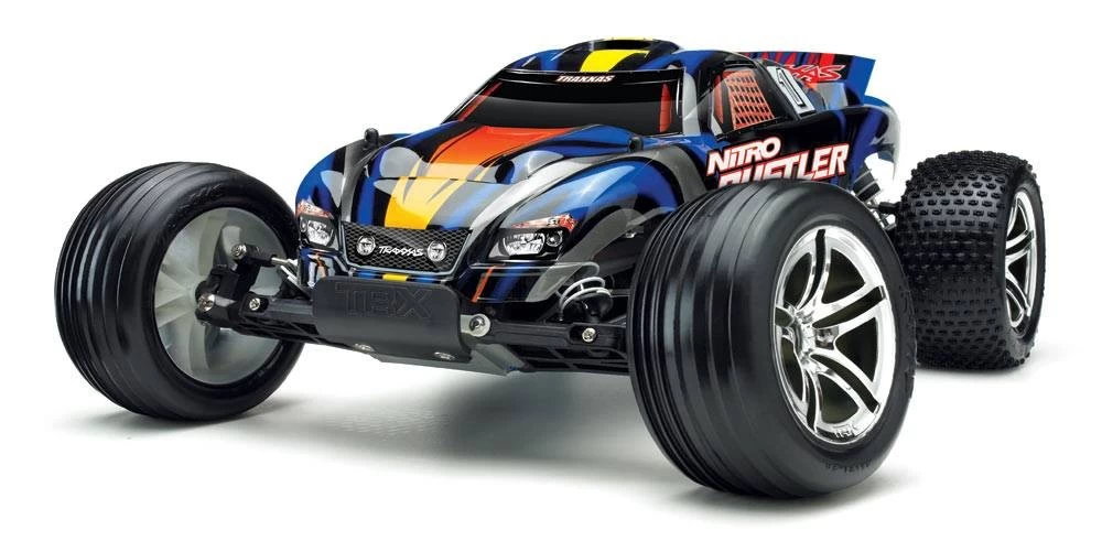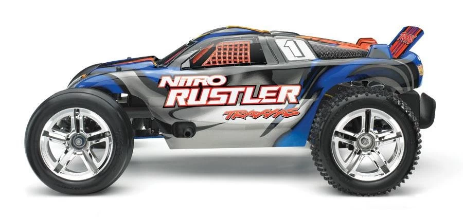 The Nitro Rustler is the first name in high performance 2WD nitro stadium trucks. Powered by the proven performance of the TRX 2.5 Racing Engine, Nitro Rustler totally out-muscles the competition with top speeds beyond 50 mph! The TRX 2.5 also pumps out the torque for brutal, wheel-standing launches and absolutely ruthless acceleration. The sleek body design cheats the wind with its smooth curves and low-slung stance, while the outrageous graphics dominate with style. The separate wing securely bolts to the body with precise aluminum hex hardware. Chrome 2.8 Twin Spokeโข rims are wrapped with pre-glued Aliasโข step-pin tires in the rear and Aliasโข ribbed tires up front. The high-tech rubber compound ensures great grip on a variety of surfaces. Grey-molded composite parts are thoughtfully integrated to enhance the look of the chassis. Fast, light, and loaded with power, Nitro Rustler’s power-sliding, dirt roosting attitude will have you reaching for the throttle again and again.