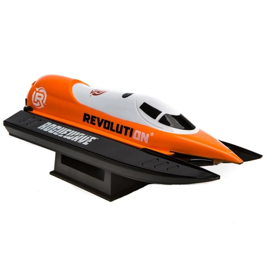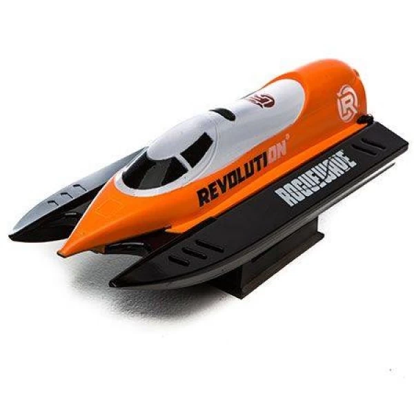 The Revolutionยฎ Roguewaveโข 10-inch self-righting F1 tunnel hull is a quick, nimble and durable electric boat that is perfect for pools or small ponds, and Ready-To-Run right out of the box. The impact resistant hull houses waterproof electronics like the speed control, steering servo and 2.4GHz receiver while the rechargeable battery offers zippy performance and good run times. But the awesome benefit of this boat is that you’ll never have to worry about capsizing. The Roguewave tunnel hull is designed with self-righting capability so it always flips upright no matter how much wake you make.