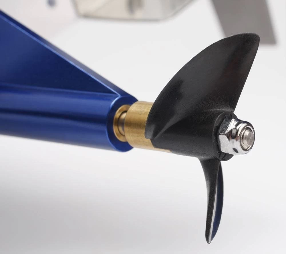 - Blue-anodized aluminum rudder support, rudder, and drive strut
