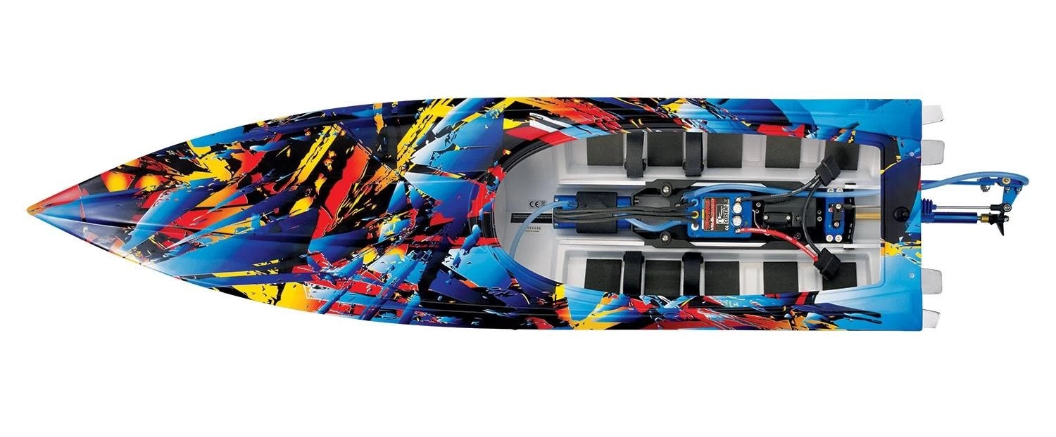The Spartan’s clean, modern hull design is built up in layers for maximum rigidity where it matters most, the transom and ride pad. Lightweight yet incredibly strong, Spartan’s ABS hull is designed to withstand the stress of high-voltage brushless horsepower, without the weight penalty of a fiberglass hull. The transom bulkhead also incorporates bosses for the trim tabs, turn fins, rudder support, and drive strut, eliminating the need for additional hardware inside the hull. In the Spartan’s bow, molded foam is form-fitted to the interior, adding security as it further stiffens the hull. Outside the hull, Spartan impresses with its wild new factory-applied graphicsโa Traxxas trademark.