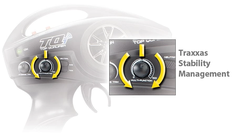 Traxxas Stability Management (TSM) makes it possible to experience all the extreme power, speed, and acceleration that was engineered into Traxxas models by making it much easier to control the vehicle on common slippery surfaces such as loose dirt, smooth concrete, and even ice and snow. Punch it off the line and TSM goes to work sensing the vehicleโs direction and making steering corrections to provide straight-ahead full throttle acceleration without fishtailing, spinouts, and loss of control. TSM also works during cornering, first making intuitive corrections to maintain the vehicleโs line, then hammer the throttle earlier in the turn for much faster exit speeds. Braking is dramatically improved as TSM works to keep Traxxas trucks arrow straight until they come to a complete stop. Traxxas TSM gives all the benefits modern electronic stabilization has to offer without intruding on driving fun or introducing unexpected side effects that can be found on other systems such as drastically reduced turning radius, braking assistance that times out (quits), throttle restrictions, and an overall disconnected driving feel. Traxxas engineers developed superior tuning algorithms that run on high-speed, precision electronic components to create a system that works invisibly, in the background, without ever limiting throttle. TSM can be fine tuned (or turned off) for different surfaces by simply adjusting the multi-function knob on the TQi transmitter, or by adjusting the slider in the Traxxas Link app. The result is driving faster, with more ease, and having more fun. In fact, the driver may not even realize how much TSM is helping until it is turned off and their driving skills are tested without it! (click here for more details)