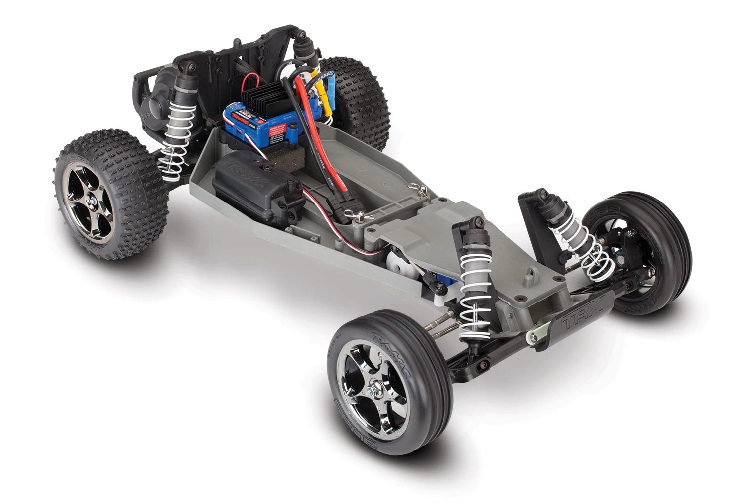 Bandit VXL comes with stylish 2.2″ Tracerโข black-chrome five-spoke wheels. Performance-designed Aliasโข 2.2″ rear tires feature a step-pin design and come pre-glued from the factory. Aliasโข ribbed front tires offer superior directional control. The tire combination provides sure-footed traction on a variety of off-road terrains. The industry standard 2.2″ Tracer wheels allow for a wide array of accessory tires to be installed, including the Traxxas Anaconda 2.2″ street tires for Bandit and other buggies. The look is unmistakeable.