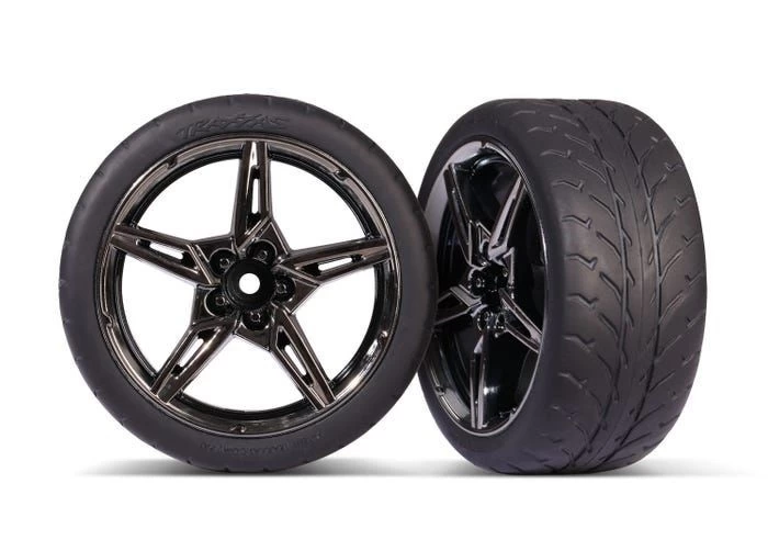 A set of two (2) Traxxas part #9371, Rear 2.1″ Response Tires on Split-Spoke Black Chrome Wheels, assembled, glued (extra wide)