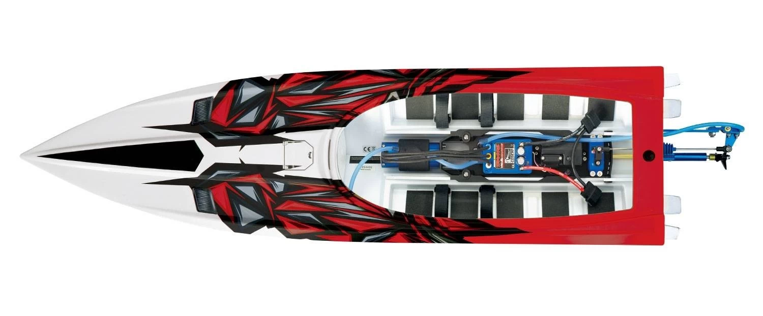 The Spartan’s clean, modern hull design is built up in layers for maximum rigidity where it matters most, the transom and ride pad. Lightweight yet incredibly strong, Spartan’s ABS hull is designed to withstand the stress of high-voltage brushless horsepower, without the weight penalty of a fiberglass hull. The transom bulkhead also incorporates bosses for the trim tabs, turn fins, rudder support, and drive strut, eliminating the need for additional hardware inside the hull. In the Spartan’s bow, molded foam is form-fitted to the interior, adding security as it further stiffens the hull. Outside the hull, Spartan impresses with its wild new factory-applied graphicsโa Traxxas trademark.