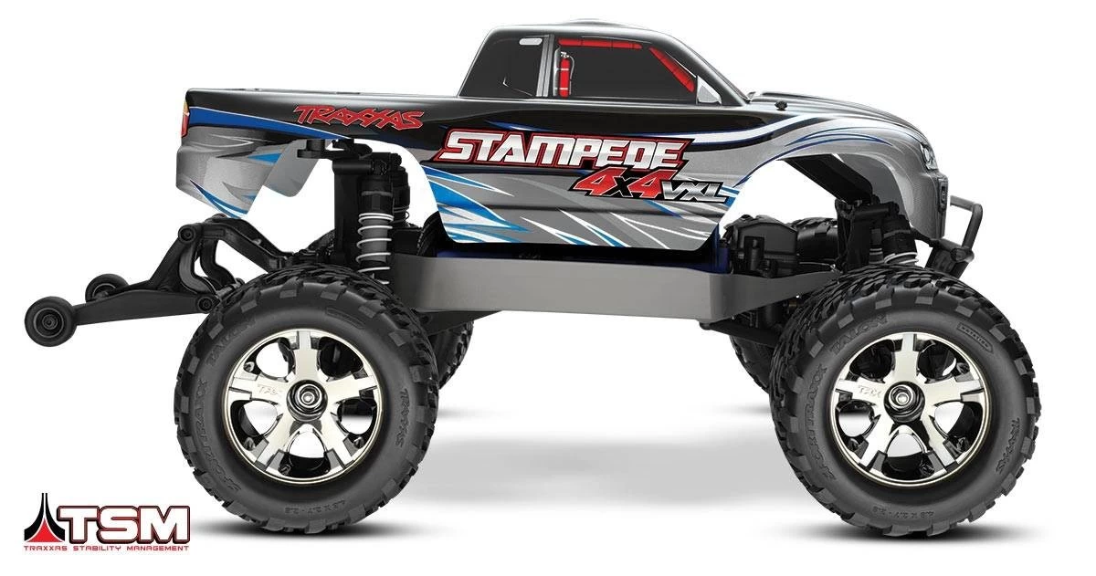 The Stampede 4X4 VXL is engineered like no other to turn extreme power into extreme monster truck fun! Traxxas Stability Management (TSM) lets you experience Stampedeโs extreme power, speed, and acceleration by making it much easier to control on slippery surfaces such as loose dirt, smooth concrete, and even ice and snow. The efficient, low-mass drivetrain is totally optimized for the brutal torque of Velineon brushless power, and following the legacy of the Stampede name, this 4X4 is overbuilt and Traxxas Tough to withstand all the 4-wheel drive monster mayhem you can dish out. The patented adjustable wheelie bar is required equipment as Stampede 4X4 launches hard, sending the front wheels soaring for the sky. You’re in full control with the Traxxas TQi 2.4GHz radio system and the superior handling of fully independent suspension and smooth bellcrank steering. Choose a 7-cell NiMH battery (sold separately) for 35+mph speed or install a 3S LiPo pack, and Stampede 4X4 shatters the speedometer with 60+mph speed! It’s brushless done the Traxxas way: brutally fast and easy to use.